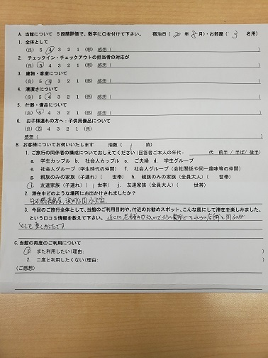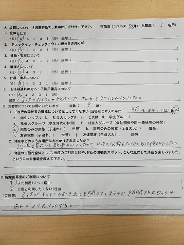 2020.8 4名用 全体として★★★★ プリンタースキャナーがあると大変助かった。海外帰国での待機期間中に対応して頂き大変助かりました。 2020.8 4名用 全体として★★★★ 日本橋高島屋・浜町公園・水天宮に行きました。近くに老舗が多いので、夕方の散歩でそちらの店舗を周るのがとても楽しかったです。 2020.8 2名用 全体として★★★★★ 施設は清潔でもちろん、スタッフの方々の対応がきめ細かくて子連れ長期滞在にはストレスフリーで有難かったです。本当に有難うございました。 2020.8 4名用 全体として★★★★★ 子供のおもちゃや絵本がたくさんあってとても助かりました。近場に買い出しと散歩のみでしたが、お店も公園もたくさんあって便利でした。子供がキッチンの引き出しを開けてしまうので開閉防止ロックがあればより良かったです。 以前の内容はこちら