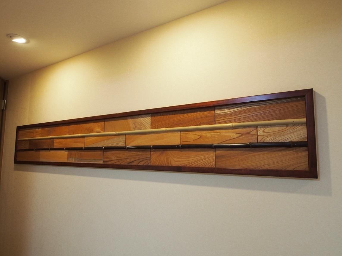 客室には欅(ケヤキ)と竹の木のぬくもり。職人手作り、1点物の壁装飾