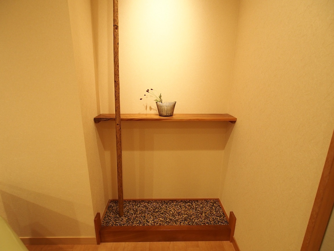 沙羅の自然木と、松の板などで組み合わせた和飾り。小さなお子様の手が届かない高さに設け、装飾品はお子様が手に取れないように工夫されています。和の雰囲気の中、安心してお過ごしいただけます。