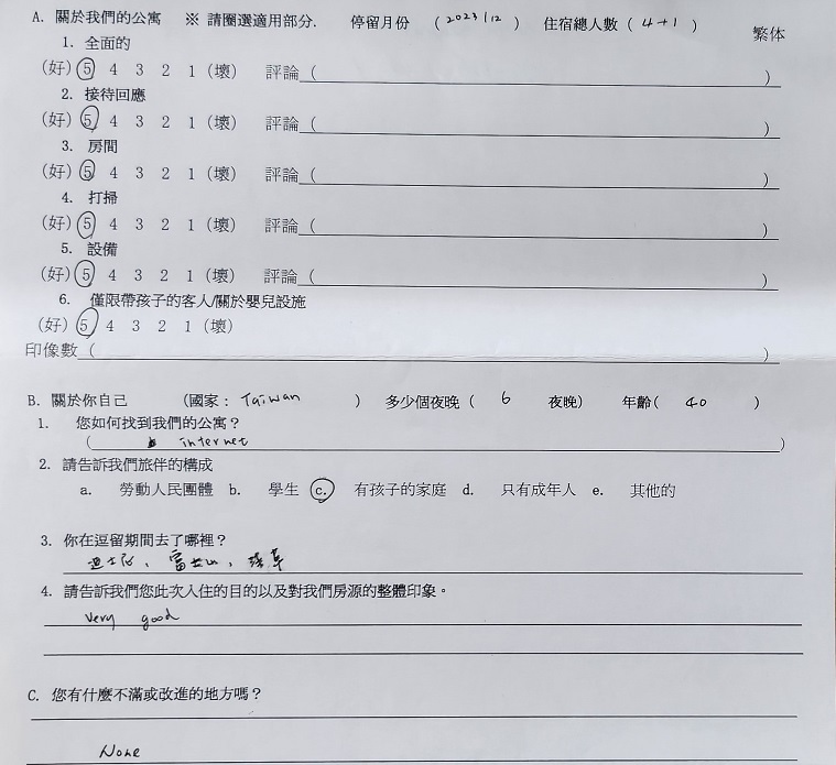 2023.12 ★★★★★ (使用者人數:4人 / 3LDK)環境很好地點很方便 2023.12 ★★★★ (使用者人數:3人 / 3LDK)房子本身不錯。配套齊全。很乾淨很整潔。距離地鐵站很近,步行兩三分鐘。就是所處街道有不少居酒屋。晚上會略吵。另一方面來說,對於喜歡吃宵夜的人來說就非常友好。 2023.12 ★★★★★ 2023.12 ★★★★★ 查看過去的評論 PAGE TOP