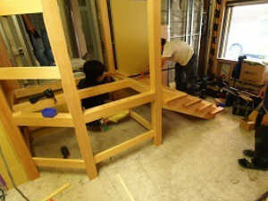 制作中の階段部分。3人がかりでの取り付け作業です。