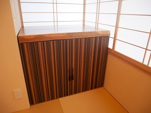 下駄箱の上が欅一枚板の天板になっており、お部屋を区切るアクセントになっています。客室に入ったとたんに圧倒的な存在感でお出迎え致します。