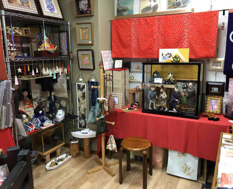 職人さん手づくりの木製の和舟模型や障子型額縁は、海外へのお土産として購入される方もいるとか。創作人形は随時展示品が変わります。