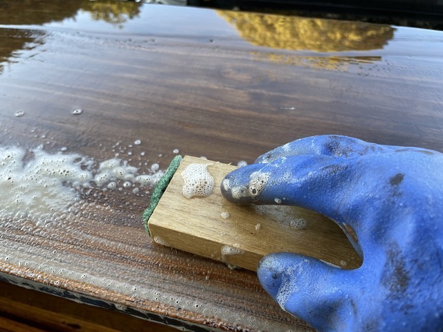 桐箪笥の仕上げは天然の土(砥の粉)をヤシャの実を煮出した液とを配合したもので塗られています。それをいったんキレイに落とします。