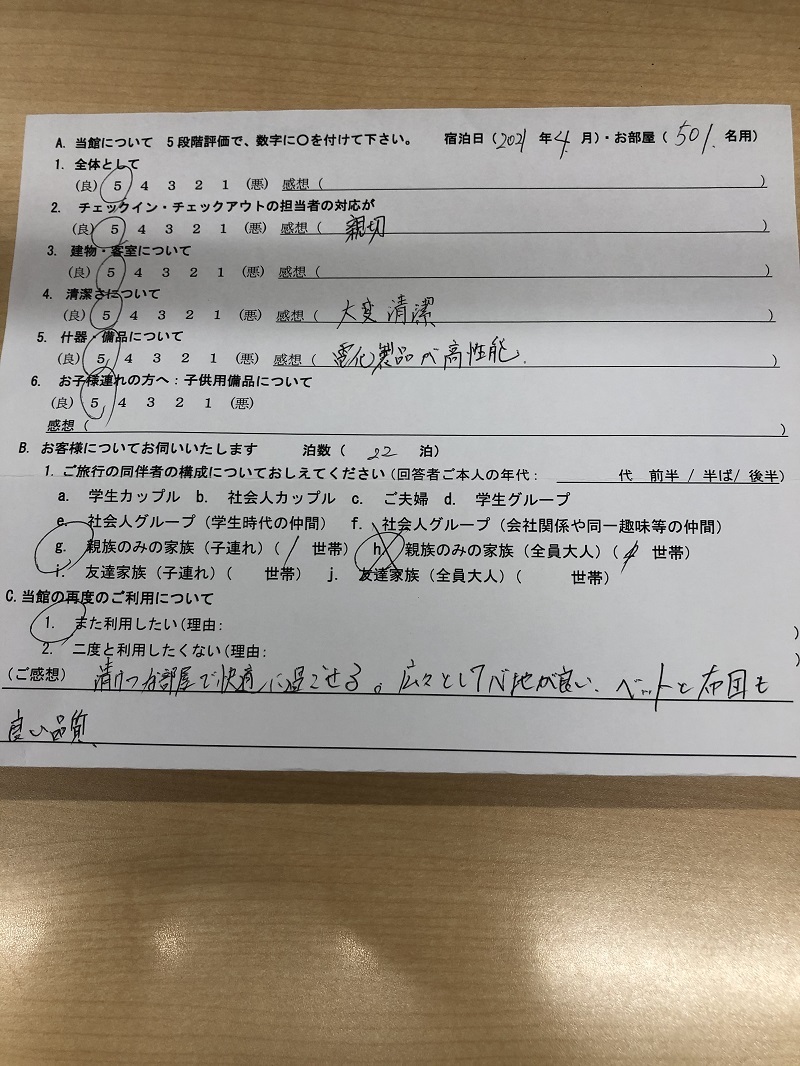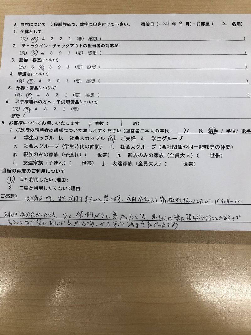 設備が子連れにすごく配慮していただいた作りになっており、とても安心・快適に過ごすことができた。ホテルの案内書類も、きめ細かに近隣マップやルールなどが書かれていたので、わざわざ受付の方に聞きに行かなくてもよく、助かりました。どうもありがとうございました。