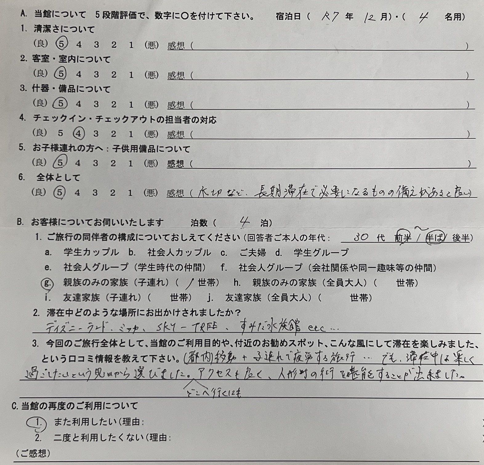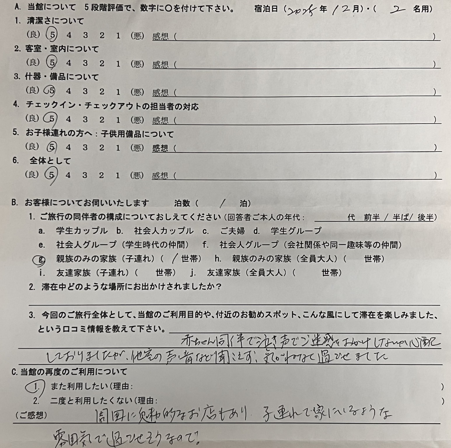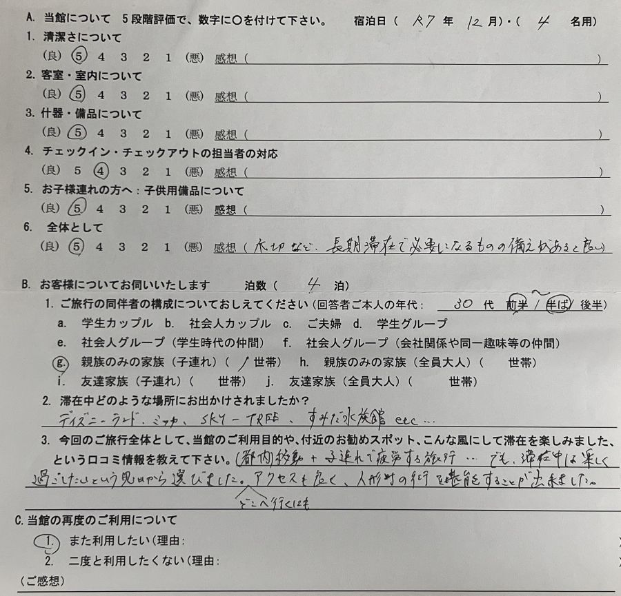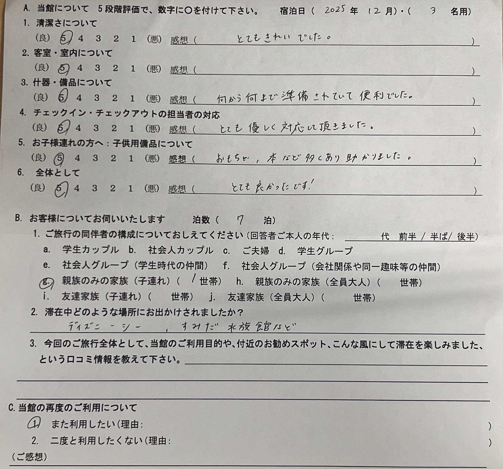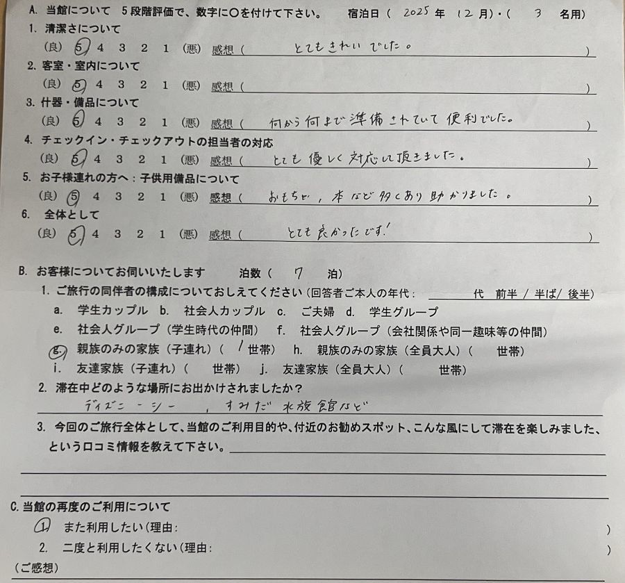 2025.12 3名利用 全体として★★★★★ とてもきれいでした。何から何まで準備されていて便利でした。とても優しく対応して頂きました。おもちゃ・本など多くあり助かりました。全体として、とても良かったです! 2025.12 4名用 全体として★★★★★ 爪切りなど長期滞在で必要になるものの備えがあると良い。都内移動、子連れで疲労する旅行・・・でも、滞在中は楽しく過ごしたいという思いから選びました。どこへ行くにもアクセスも良く、人形町の街を堪能することが出来ました。 2025.12 2名用 全体として★★★★★ 赤ちゃん同伴で泣き声でご迷惑をおかけしないか心配しておりましたが、他室の声・音など聞こえず、気がねなく過ごせました。周囲に魅力的なお店もあり、子連れで家にいるような雰囲気で過ごせそうなのでまた利用したい。 以前の内容はこちら