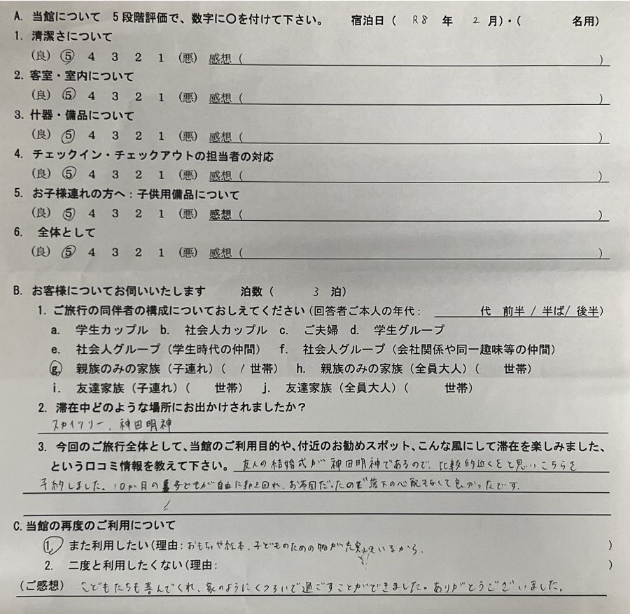 2026.2 4名用 全体として★★★★★ 友人の結婚式が神田明神であるので、比較的近くをと思いこちらを予約しました。10か月の子供が自由に歩き回れ、お布団だったので落下の心配もなくて良かったです。おもちゃや絵本・子どものための物が充実している。こどもたちも喜んでくれ、家のようにくつろいで過ごすことができましうた。ありがとうございました。 以前の内容はこちら