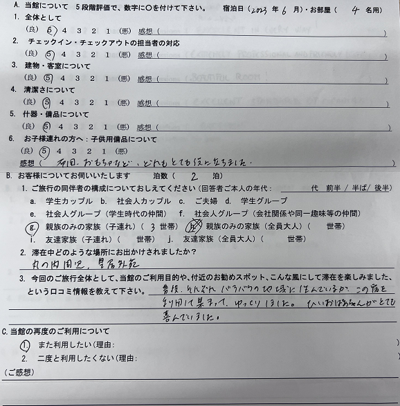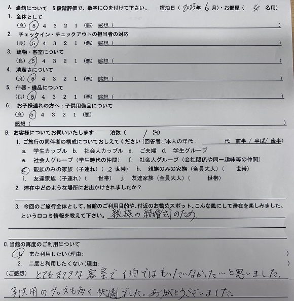 普段、それぞれバラバラの地域に住んでいるが、この宿を利用して集まって、ゆっくりしました。ひいおばあちゃんがとても喜んでいました。