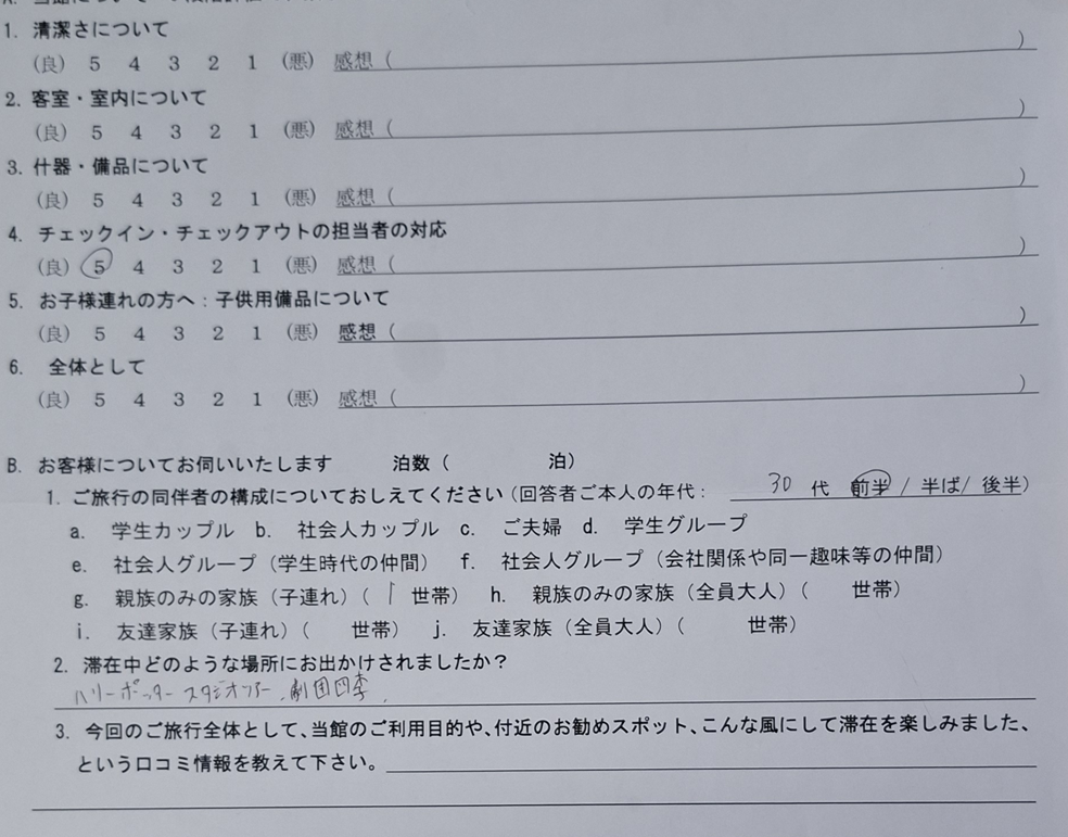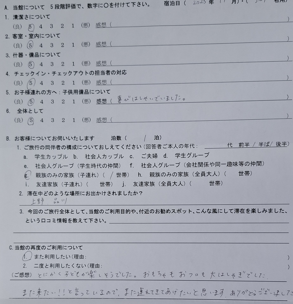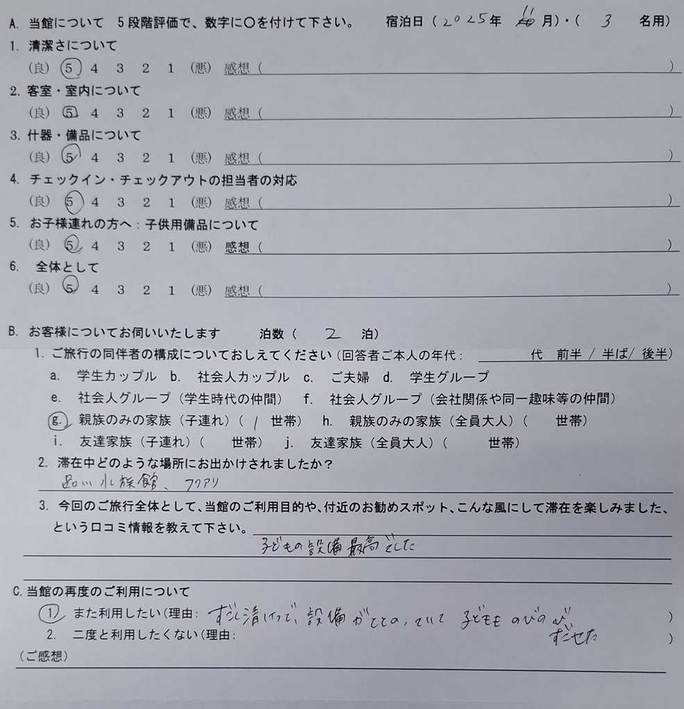 2025.11 4名用 全体として★★★★★ 子供用備品は、喜びはしゃいでいました。とにかく子どもが楽しそうでした。おもちゃもお風呂も大はしゃぎでした。また来たい!!と言っているのでまた連れてきてあげたいと思います。ありがとうございました。 2025.11 2名用 全体として★★★★★ 子どもの設備最高でした。品川水族館、フクアリに出かけました。すごく清潔で、設備がととのっていて子どもものびのび過ごせた。 2025.11 2名用 全体として★★★★★ ハリーポッタースタジオツアー、劇団四季に行きました。 以前の内容はこちら