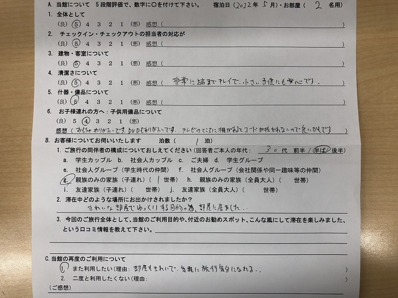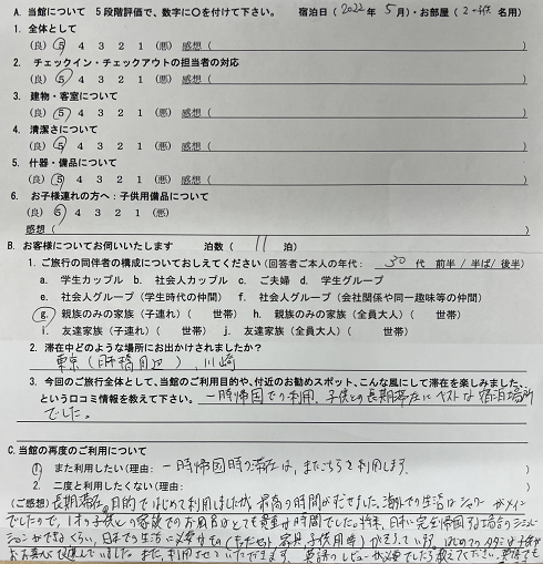 長期滞在の目的ではじめて利用しましたが、最高の時間がすごせました。海外での生活はシャワーがメインでしたので、1才の子供との家族でのお風呂はとても貴重な時間でした。将来、日本に完全帰国する場合のシュミレーションができるくらい、日本での生活に必要なもの(キッチンセット、家具、子供用等)がそろっています。はじめてのタタミは子供が大喜びで遊んでいました。また利用させていただきます。英語のレビューが必要でしたら教えて下さい。英語でも書きます。