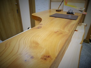 一枚板の欅を、使い勝手よく綺麗な曲線にカットしてもらいました。