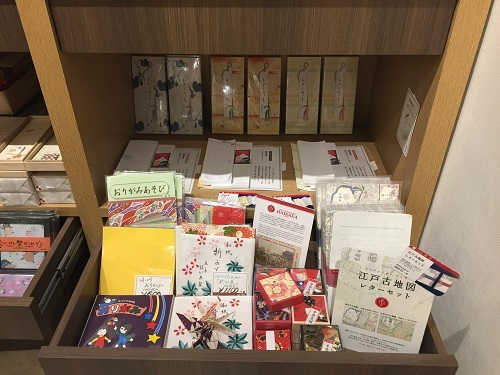 ほかにも日本橋にある江戸時代からつづく老舗、”榛原”の和紙折り紙や雑貨、江戸時代の日本橋が描かれている古地図レターセット、和装に合うくみひも雑貨なども充実。
