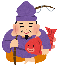 右手に釣り竿・左手に鯛を持ち、初めは、豊漁の神様として崇められていましたが、 後に、「えびす顔」ということで、商売繁盛の神様として変化をしていきました。