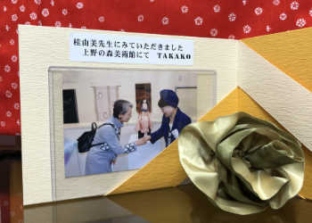 こちらは上野の森美術館に創作人形を出展時、有名デザイナー「桂由美先生」にご覧いただいた時の写真。