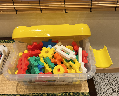 ブロックはひと箱まるまる、お部屋にお持ちいただけます。2箱ご用意していますよ。アンパンマンブロックもございます。