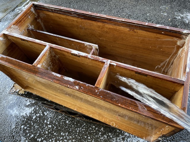 桐箪笥の仕上げは天然の土(砥の粉)をヤシャの実を煮出した液とを配合したもので塗られています。それをいったんキレイに落とします。