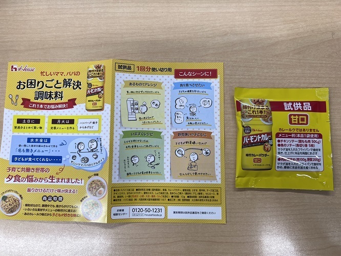ハウス食品さまよりご提供で、「味付けカレーパウダー・バーモントカレー味」をお配りしております。子供たちも大好きですよね、バーモントカレー(^^)