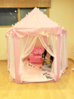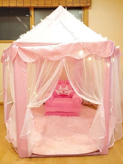 撮影スポットとして”映え”はもちろん、ちゃんと”遊べるテント”にしています。プリンセスの椅子は伸ばすことができるので、リラックスしながら絵本を読んだり♪
