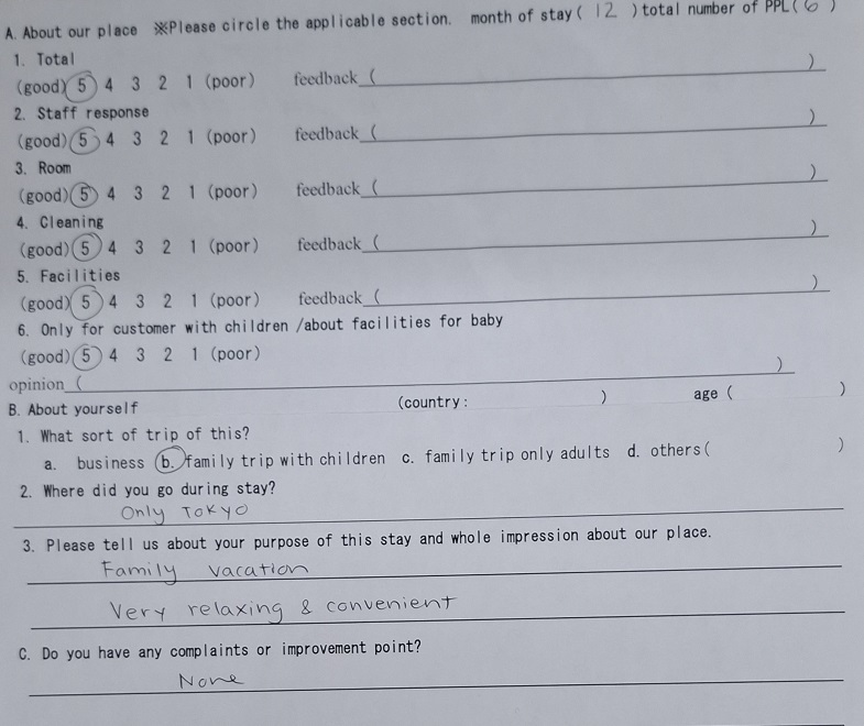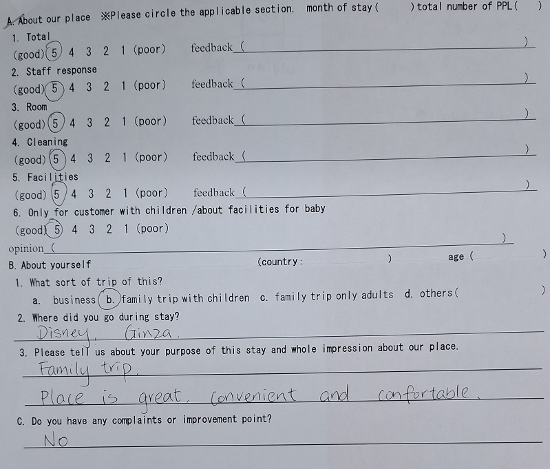 The room was perfect for our family of 4 adults and 2 kids. Spacious for being so close to the middle of Tokyo. Very clean. Lots of extras for kids with the baby equipment and toy closet in the lobby. Super helpful and friendly lobby staff. Great location, very walkable to subway, restaurants, and airport bus station.