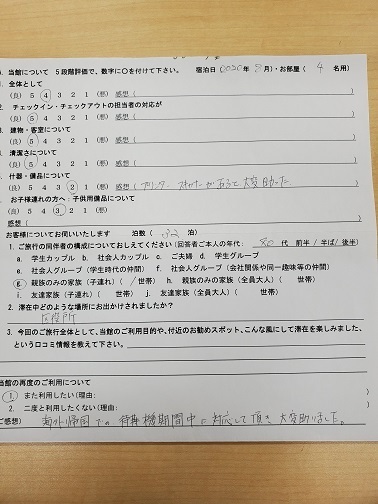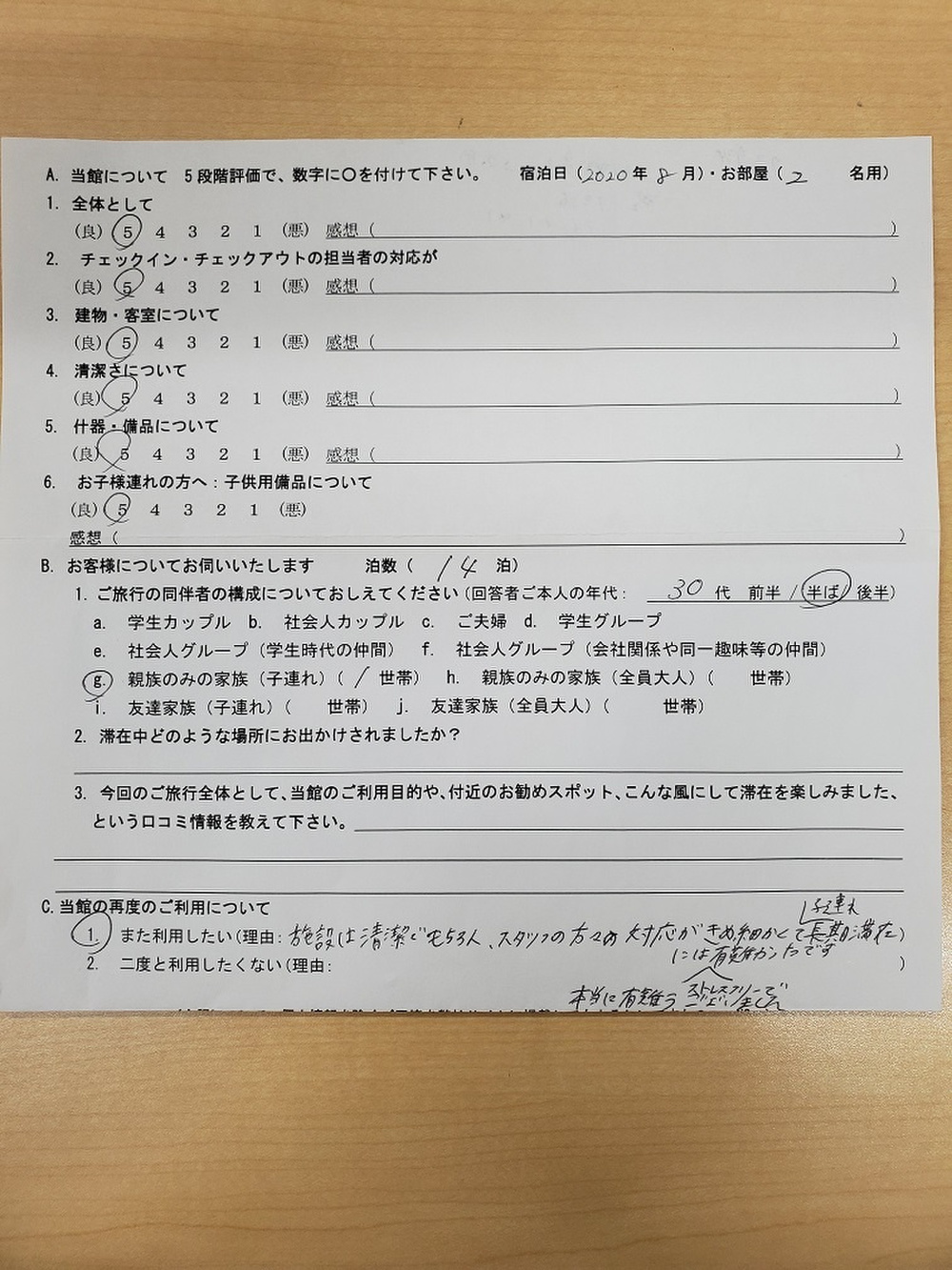 2020.8 4名用 全体として★★★★ プリンタースキャナーがあると大変助かった。海外帰国での待機期間中に対応して頂き大変助かりました。 2020.8 4名用 全体として★★★★ 日本橋高島屋・浜町公園・水天宮に行きました。近くに老舗が多いので、夕方の散歩でそちらの店舗を周るのがとても楽しかったです。 2020.8 2名用 全体として★★★★★ 施設は清潔でもちろん、スタッフの方々の対応がきめ細かくて子連れ長期滞在にはストレスフリーで有難かったです。本当に有難うございました。 2020.8 4名用 全体として★★★★★ 子供のおもちゃや絵本がたくさんあってとても助かりました。近場に買い出しと散歩のみでしたが、お店も公園もたくさんあって便利でした。子供がキッチンの引き出しを開けてしまうので開閉防止ロックがあればより良かったです。 以前の内容はこちら