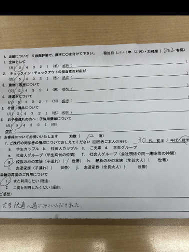 みなさんとても親切にご対応して頂き、快適に滞在することができました。小さい子連れだったので、和室でお布団で寝れたのが、とても助かりました。新しい家のようにきれいでした。備品も特に足りないものなどなく、満足です。