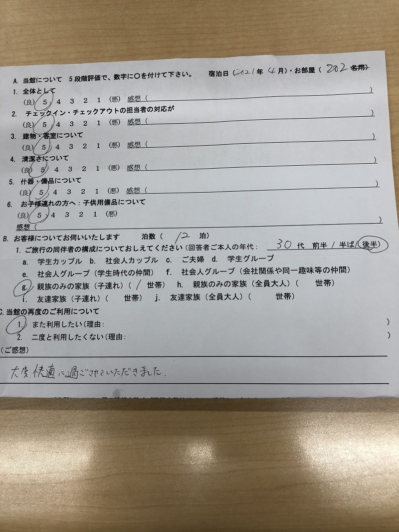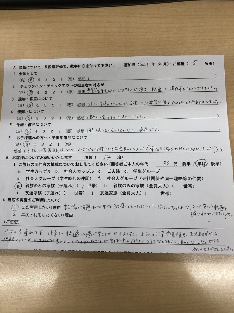 設備が子連れにすごく配慮していただいた作りになっており、とても安心・快適に過ごすことができた。ホテルの案内書類も、きめ細かに近隣マップやルールなどが書かれていたので、わざわざ受付の方に聞きに行かなくてもよく、助かりました。どうもありがとうございました。