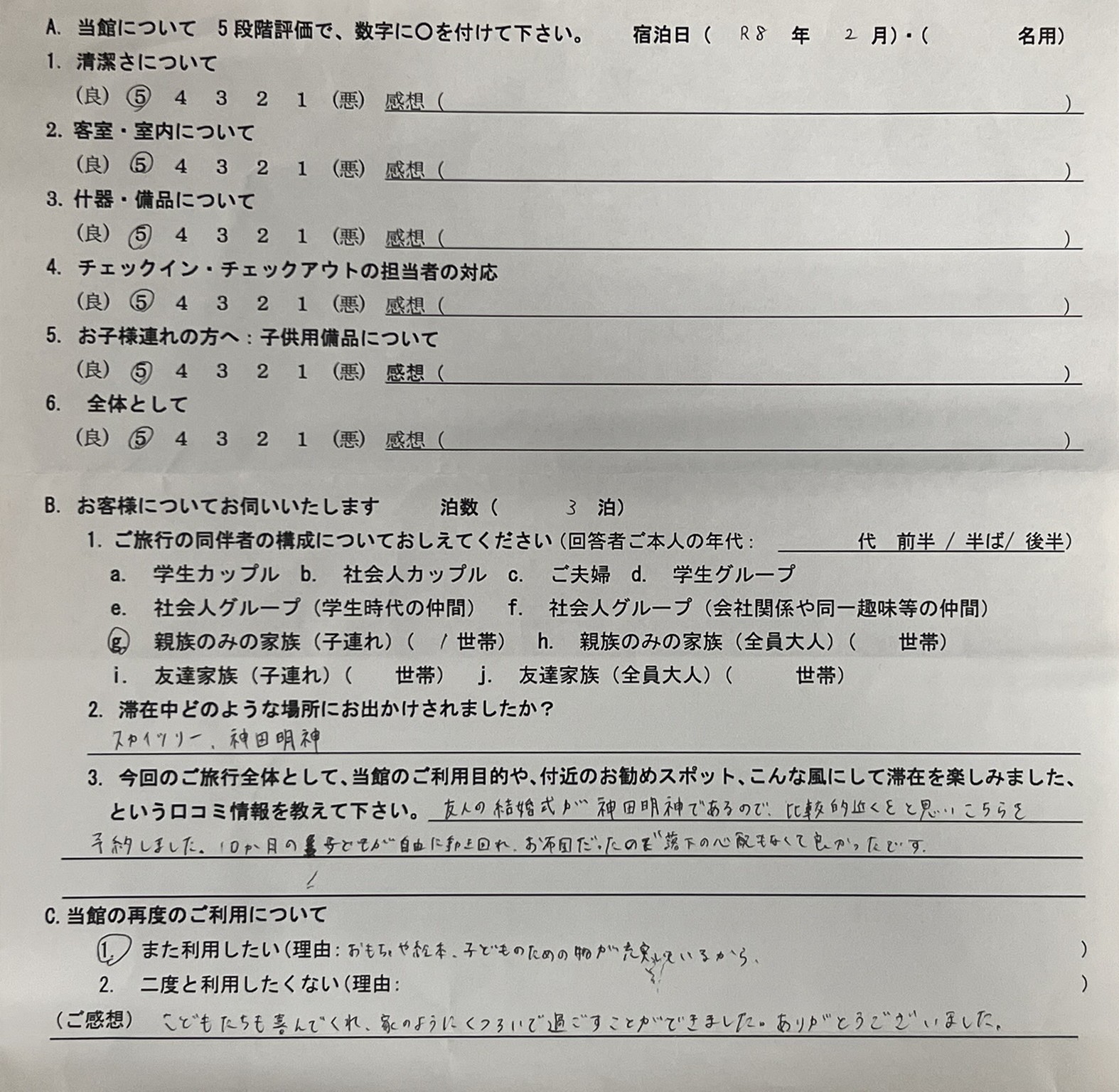 2026.2 4名用 全体として★★★★★ 友人の結婚式が神田明神であるので、比較的近くをと思いこちらを予約しました。10か月の子供が自由に歩き回れ、お布団だったので落下の心配もなくて良かったです。おもちゃや絵本・子どものための物が充実している。こどもたちも喜んでくれ、家のようにくつろいで過ごすことができましうた。ありがとうございました。 以前の内容はこちら