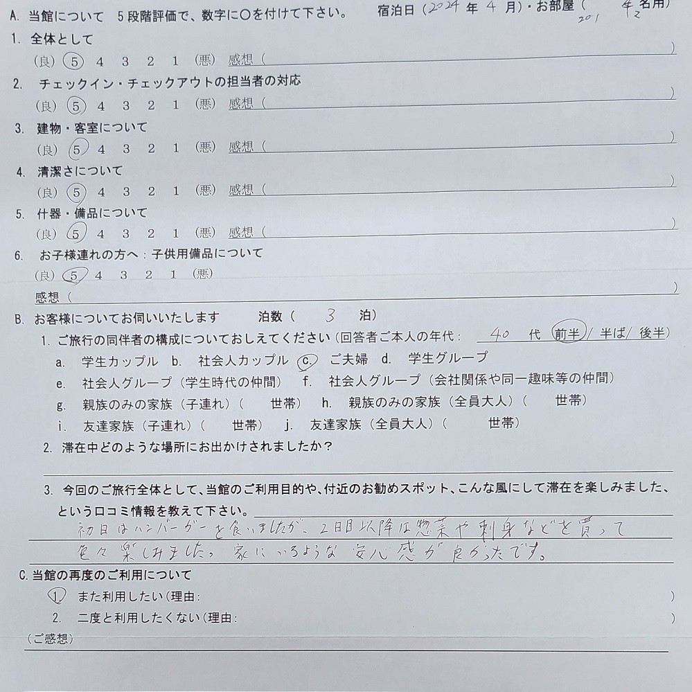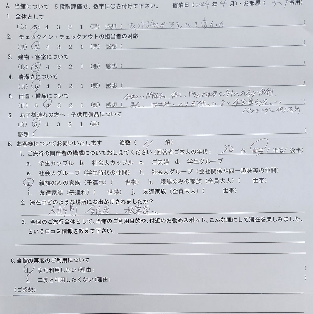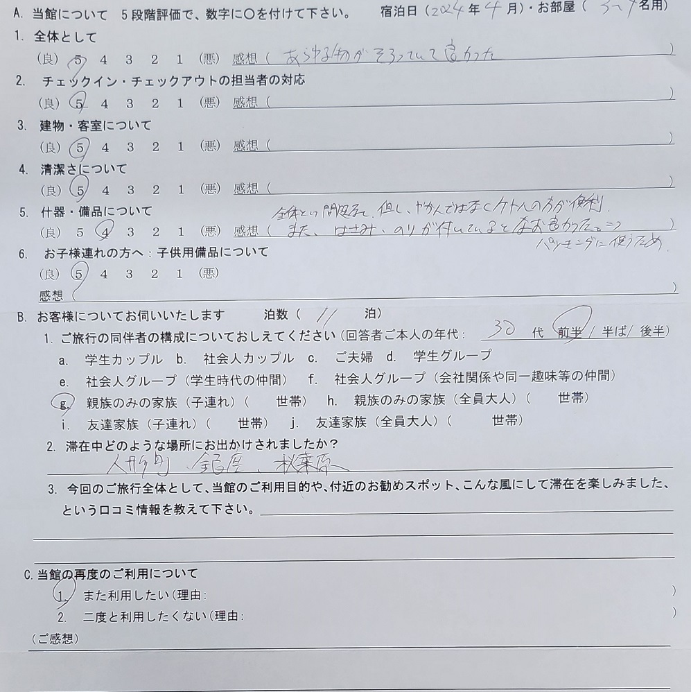 2024.4 2名用 全体として★★★★★ 初日はハンバーグを食べましたが、2日目以降は惣菜や刺身などを買って色々楽しみました。家にいるような安心感が良かったです。 2024.4 4名用 全体として★★★★★ あらゆる物がそろっていて良かった。全体として問題なし。但し、はさみ・のりが付いてるとなお良かった。(パッキングに使うため)人形町、銀座、秋葉原に出かけた。また利用したい。 以前の内容はこちら