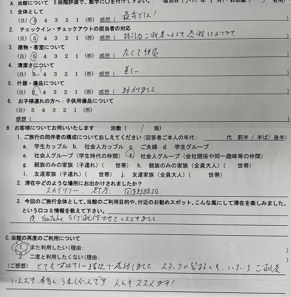 (裏面)お陰様でゆっくり過ごすことができました。ありがとうございました。