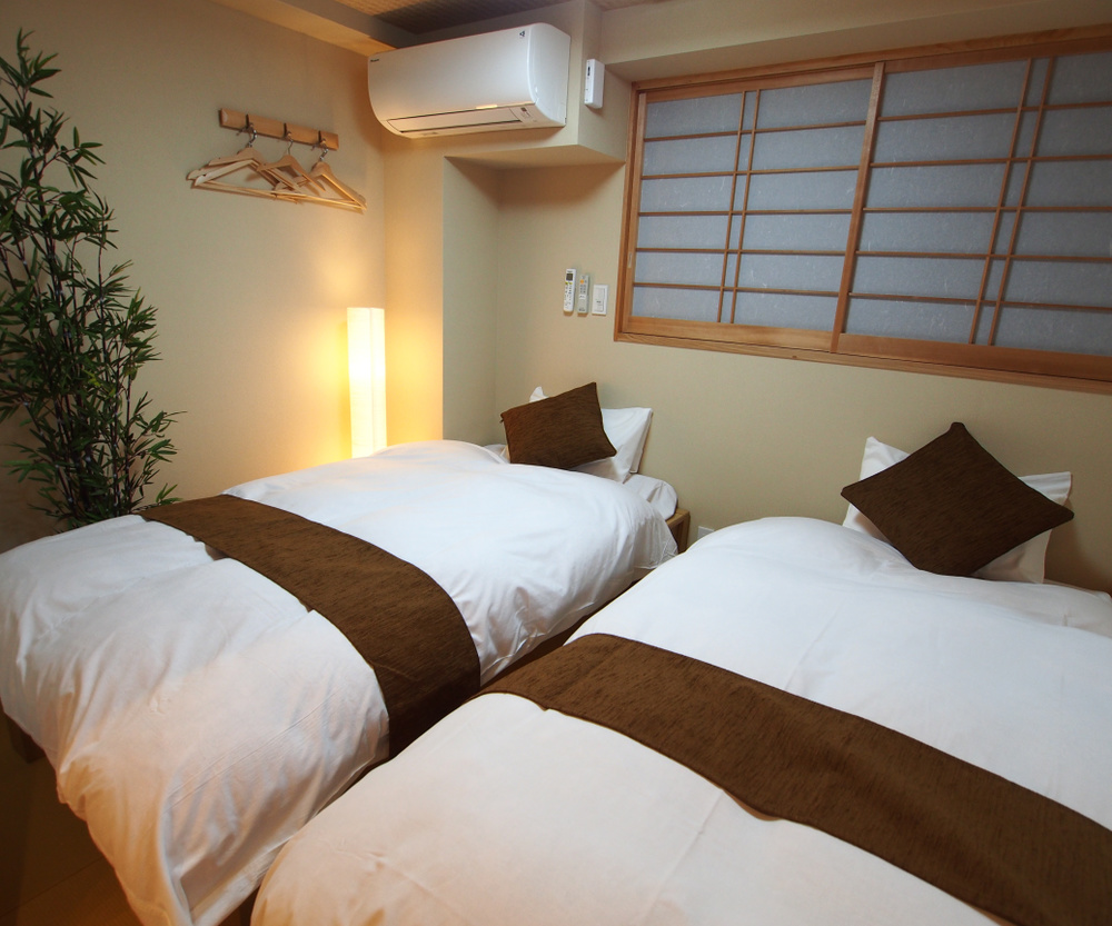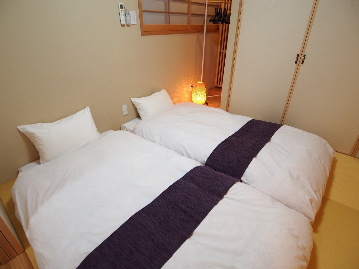 ツインベッドルーム。畳ベッドの上にムアツ布団を敷いてお休みいただけます。