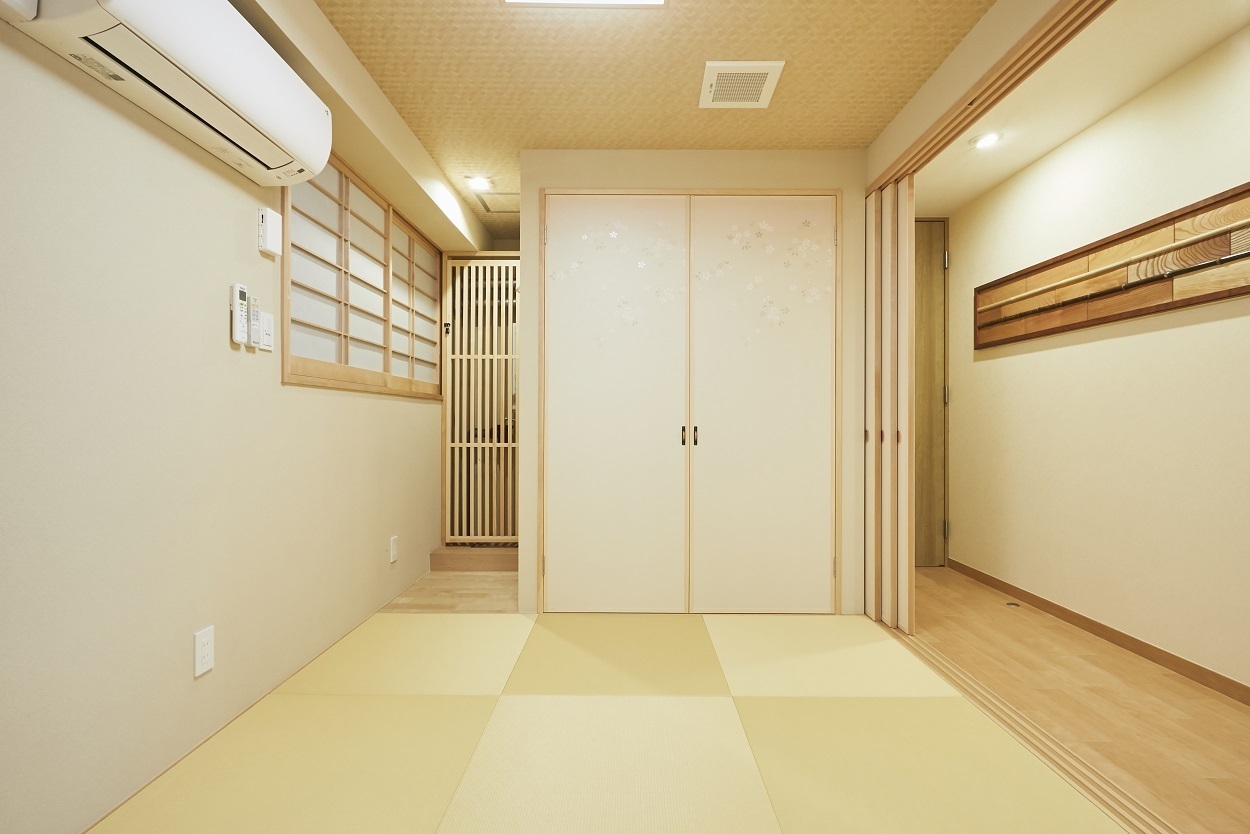 4名用・Cの客室は“寛ぎ”。ツインベッドルームと和室の2間あり。”4名用A・語らい”と同じ間取りです。リビングダイニングもゆったり設計。欅の他、竹や沙羅・松などの和の設えで落ち着いた空間。キッチンガスコンロは2口。バストイレ洗面は独立。