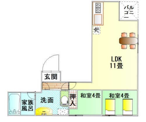 | 間取り | 和室4畳✕2間・LDK10.8畳・浴室・トイレ |
