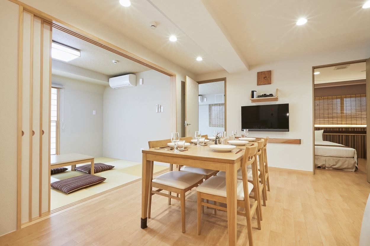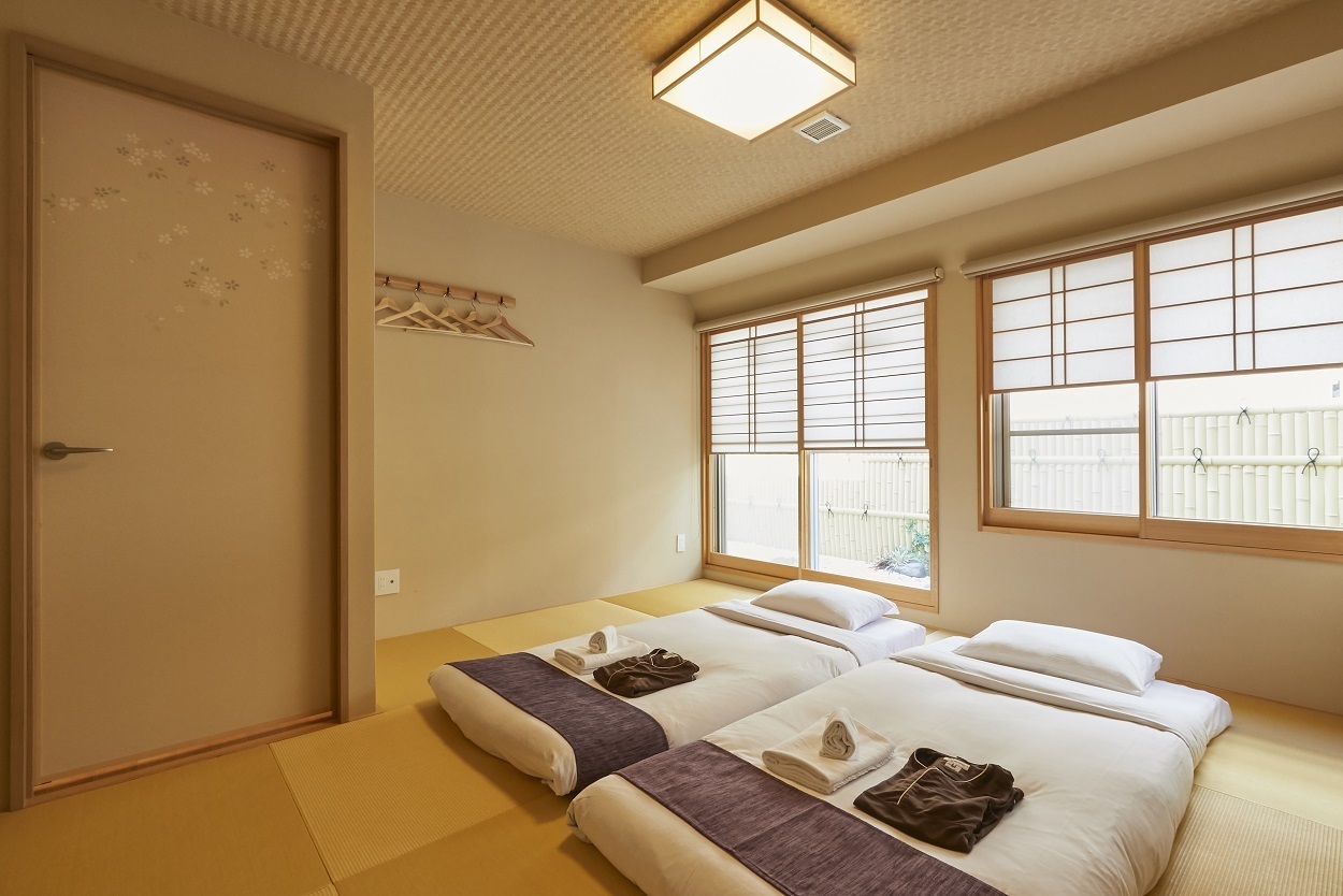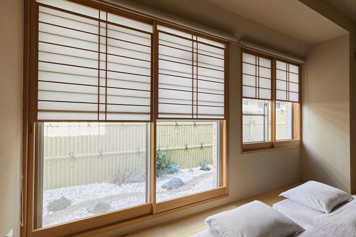 和室は襖やドアでしっかり閉まりますので、就寝時などは共有部分とは独立したお部屋となり、数世帯・男女別でのプライベートが保たれます。雪見障子からは日本橋の和風坪庭を眺める事ができます。