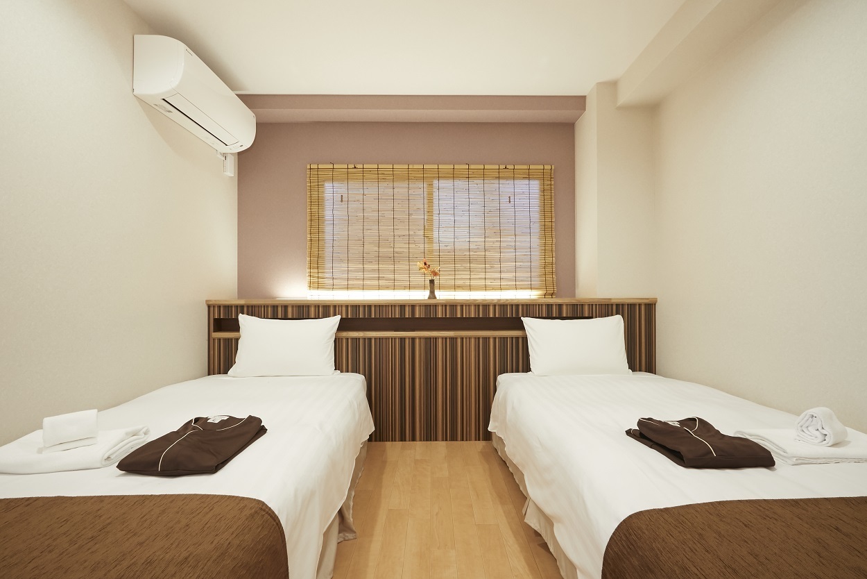 洋室にはシングルベッド2台が入っています。間接照明でゆったりした寛ぎの時間をお過ごしいただけます。