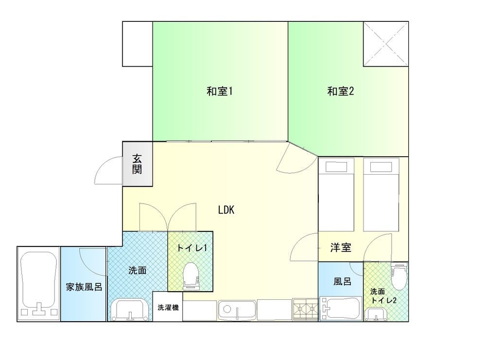 | 間取り | 90平米:和室約8畳・和室約7畳・洋室約6畳・LDK14畳・大型家族風呂・浴室1・トイレ1・浴室2・トイレ2 ★無料サービスのマッサージチェアあり |