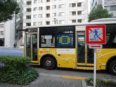 在這個停靠站的前方,有一個更醒目的紅色公車「江戸公車」(一次只要一枚100日圓硬幣。這是一輛中央區的社區公車,所以不太方便用來觀光……)停靠站,因為它很顯眼,所以Metrolink E線就在它的後面。請不要錯過了……。